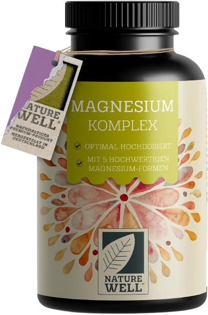 NATURE WELL bietet eine solide Kombination aus Magnesiumcitrat, -oxid, -bisglycinat, -ascorbat und -malat. Jedoch steht Magnesiumoxid im Vordergrund, was die Bioverfügbarkeit und Verträglichkeit des Magnesium Komplex einschränkt. Die empfohlene Tagesdosis wird abgedeckt, allerdings wäre ein höherer Citrat-Anteil wünschenswert. Leider fehlen umfassende Laboranalysen, die die Reinheit des Produktes bestätigen.