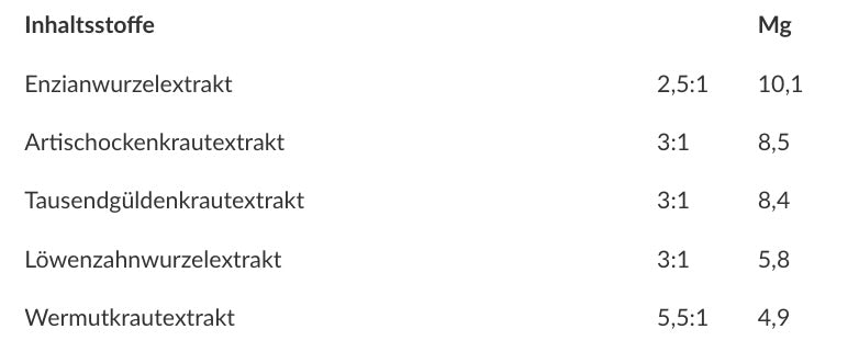 • Geringere Tagesdosis der Bitterstoffe (z.B. nur 4,5mg Enzianwurzel-Extrakt)