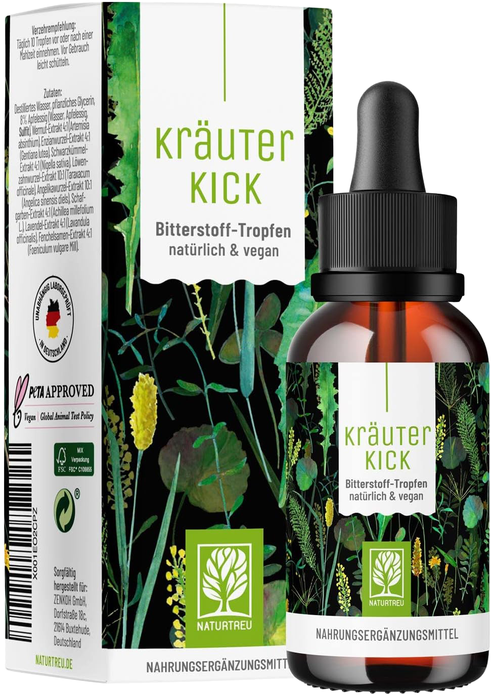 "Kräuterkick" von NATURTREU besticht durch die sinnvolle Zusammensetzung seiner Inhaltsstoffe und einer alkoholfreien Rezeptur. Auch Naturtreu stellt seine Produkte in Deutschland unter strengen Qualitäts-Standards her. Allerdings haben die Tropfen durch hinzugefügten Apfel-Essig einen süßlich-fruchtigen Geschmack, was den Zweck der Bitterstoffe widerspricht.