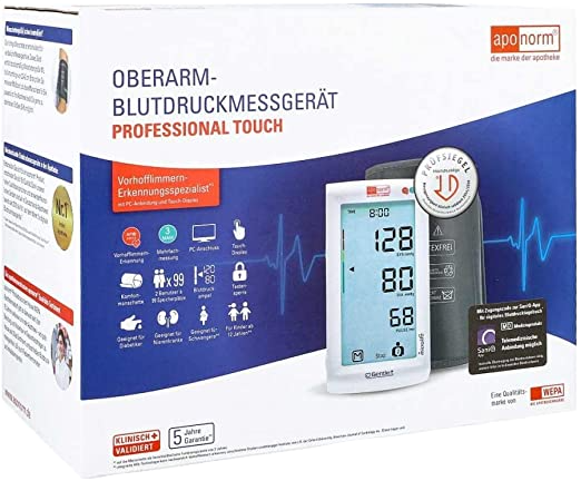 Der Aponorm Professional Touch besitzt mehrere Funktionen neben der Pulsmessung. Zu ihnen zählt das Erkennen von Herzryhtmusstörungen, die Mittelwertberechnung, das WHO-Bewertungssystem und auch die Abschaltautomatik. Außerdem kann das Gerät ohne Probleme auf einen Gast-Modus umgeschaltet werden, welcher die Nutzung für Besucher vereinfacht. Das Gerät wird in einer Stofftasche verstaut und hat über 120 Speicherplätze.