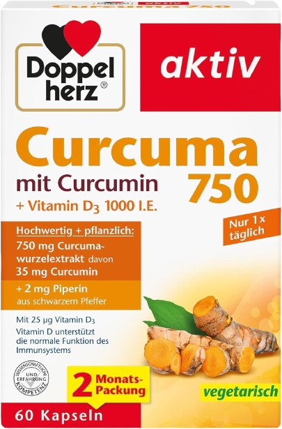Den letzten Platz unseres Vergleichs belegt das Doppelherz Kurkuma mit Curcumin. Trotz des augenscheinlich geringen Einstiegspreis von 9,95€ für 60 Kapseln kann das Präparat im Preis-Leistungs-Vergleich nicht überzeugen. Eine Kapsel enthält nur magere 35mg Curcumin. Um auf die Tagesdosis von 350mg (wie im Testsieger) zu kommen, müssen hier täglich 10 Kapseln für ingesamt 1,66€ eingenommen werden. Leider verwendet Doppelherz unnötige Magnesiumsalze als Trennmittel und veröffentlicht keine unabhängigen Laboranalysen.