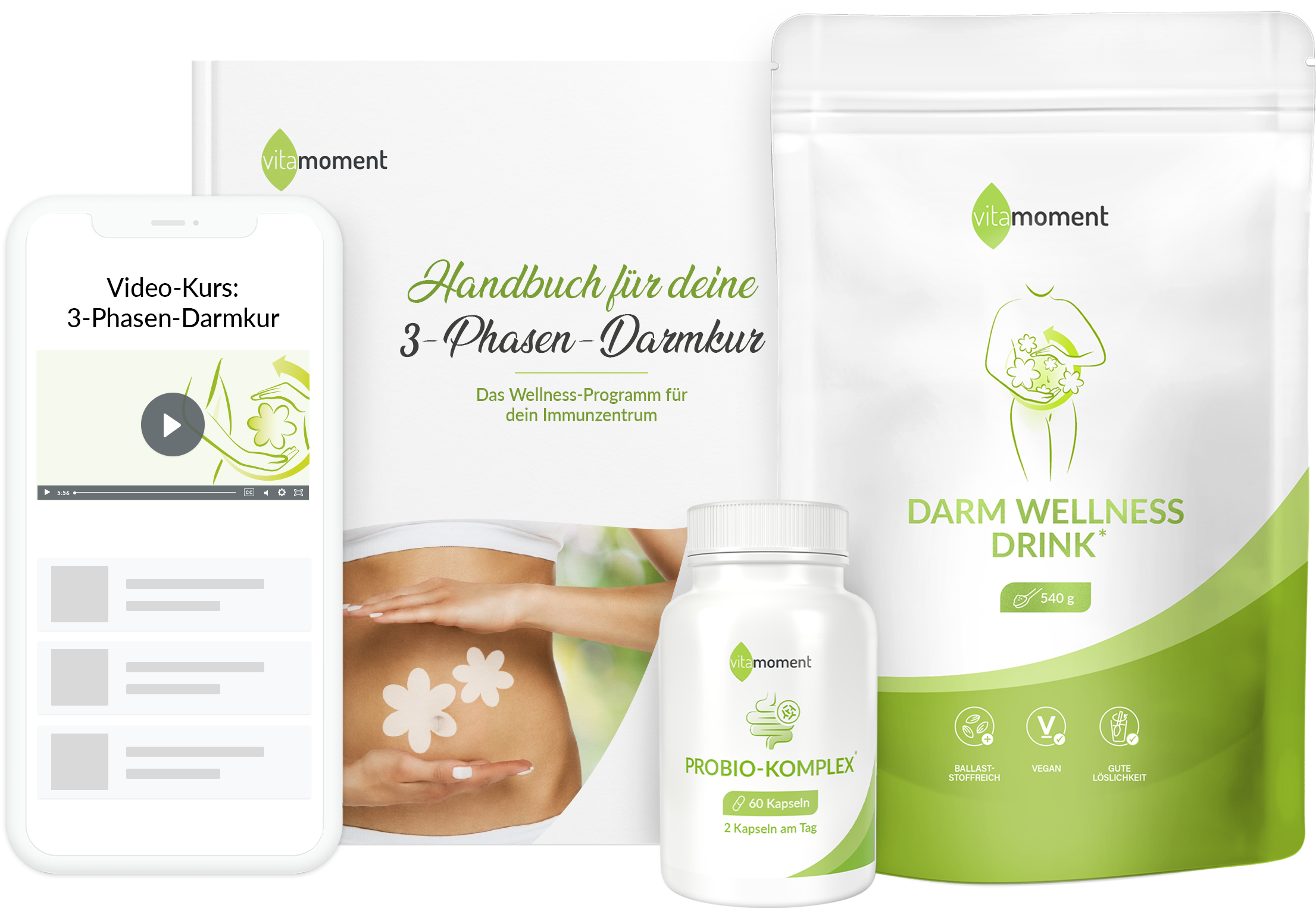 Die „3-Phasen-Darmkur" von VitaMoment hat im Testverfahren unsere Redaktion begeistert und belegt den ersten Platz in der Gesamtwertung. Diese 30-Tage-Kur kommt in einem sehr umfangreichen Paket-Umfang und verfolgt so einen ganzheitlichen Ansatz zur Darmsanierung: