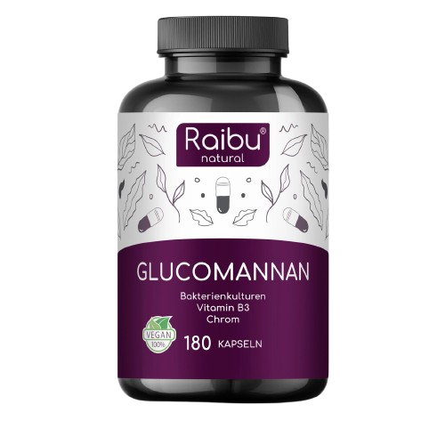 Die Glucomannan Kapseln von Raibu belegen einen knappen dritten Platz in unserem Produktvergleich. Auch dieses Präparat hat ein gutes Preis-Leistungs-Verhältnis, das auf seinen geringen Preis zurückzuführen ist. Das Präparat wird in Deutschland hergestellt und enthält zusätzlich zum Glucomannan noch Chrom, Vitamin B3 und Bakterienkulturen, die ggf. sinnvoll sein können. Leider wird auch hier eine veraltete, nicht sonderlich aussagekräftige Laboranalyse veröffentlicht. Zusätzlich schneidet das Produkt bei den Amazon Kunden mit nur 3,8 von 5 Sternen unterdurchschnittlich ab.