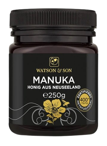 Manuka Honig stammt aus Neuseeland und wird aus den Blüten der Manuka-Pflanze (Leptospermum scoparium) gewonnen. Was ihn von herkömmlichem Honig unterscheidet, ist sein hoher Gehalt an Methylglyoxal (MGO), einer Verbindung, die für die antibakteriellen Eigenschaften des Honigs verantwortlich ist. Aus diesem Grund setzen ihn die Ureinwohner Neuseelands seit Jahrhunderten zur Behandlung von Entzündungen und Infektionen als natürliches Heilmittel ein.