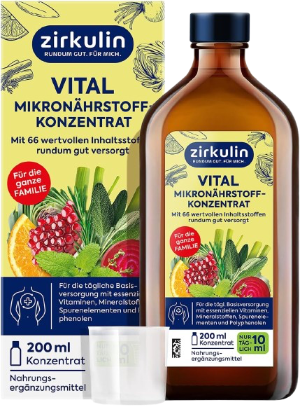 Das Mikronährstoffkonzentrat von Zirkulin bietet eine preiswerte Alternative im Bereich flüssiger Multivitaminpräparate und punktet mit einem Bio-Anteil von über 64 % bei den pflanzlichen Zutaten. Die Nährstoffversorgung fällt im Vergleich zu unserem Testsieger allerdings schlechter aus: Vitamin A, D3 und E sind gut dosiert, während Vitamin C klar unterdosiert ist und Vitamin K gänzlich fehlt. Auch Spurenelemente wie Zink und Eisen sind eher niedrig enthalten, während Magnesium überhaupt nicht vorkommt. Positiv fällt auf, dass keine künstlichen Zusatzstoffe enthalten sind, sondern auf pflanzliche und fruchtsaftbasierte Zutaten gesetzt wird. Dennoch fehlen jegliche Angaben zu Herkunft, Herstellung oder Laboranalysen. Das Produkt besteht im Wesentlichen aus Fruchtsaftkonzentraten und Pflanzenauszügen mit Multivitaminanreicherung und bietet damit eine günstige Basisversorgung.
