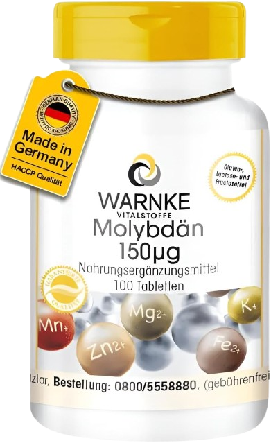 Die Molybdän Tabletten von Warnke Vitalstoffe gehen aus dem Produktvergleich als Testsieger hervor. Vor dem Hintergrund aller Qualitätsmerkmale schneiden Sie am besten ab. In diesem Präparat finden Sie eine sinnvolle Dosierung (150 µg), hohe Qualitätsstandards zu einem sehr günstigen Preis.