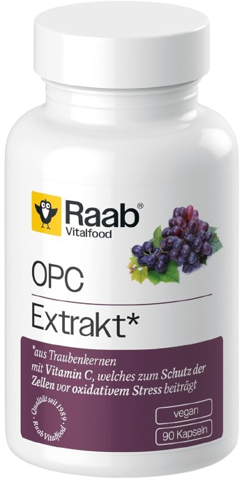 Die OPC Extrakt Kapseln von Raab Vitalfoods belegen in unserer Vergleich den 4. Platz. Obwohl der Hersteller selbst eine IFS Food Standard Zertifizierung hat, fehlen uns hier leider essentielle Informationen zu der Herkunft der Rohstoffe und der möglichen Verwendung von GMOs. Zudem fehlen unabhängigen Laboranalysen, sodass die Verbraucher:innen dem Hersteller weitestgehend vertrauen müssen. Mit einer Tagesdosis von 150 mg OPCs, die nur durch die Einnahme von drei Kapseln pro Tag zustande kommt, bekommen die Verbraucher:innen hier am wenigsten Antioxidantien geliefert. Das liegt vor allem daran, dass ein großer Teil des enthaltenen Pulvers einfaches Traubenkernmehl ist, kein Extrakt.