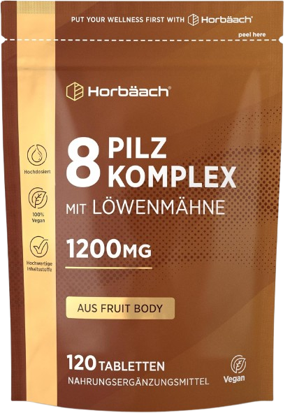 Das Präparat von Horbäach ist zwar das günstigste im Test, kann aber qualitativ mit den anderen Produkten kaum mithalten. Zwar enthält es acht verschiedene Pilzextrakte, doch die Gesamtmenge an Polysacchariden beträgt lediglich 30 mg pro Tag, ein im Vergleich extrem niedriger Wert. Zusätzlich kommen verschiedene technische Hilfsstoffe wie Dicalciumphosphat und Magnesiumsalze der Speisefettsäuren zum Einsatz. Eine transparente Laborprüfung oder Herkunftsangabe fehlen vollständig. Auch wenn die Vielfalt der Pilzarten auf den ersten Blick beeindruckt, kompensiert das nicht die mangelnde Dosierung und die fehlende Qualitätskontrolle. Für eine ernsthafte Anwendung im Bereich der Vitalpilze ist dieses Produkt nicht zu empfehlen.