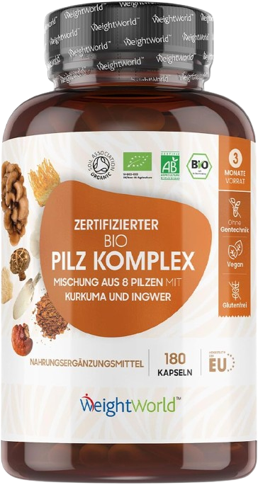 Der Bio Pilz Komplex von WeightWorld punktet mit seiner EU-Herstellung und einer offiziellen Bio-Zertifizierung – ein starkes Argument für alle, die auf geprüfte Qualität aus Europa setzen. Enthalten sind acht verschiedene Pilzarten, allerdings lediglich in Pulverform und ohne Analyse der enthaltenen Polysaccharide. Leider fehlen Laboranalysen zur Schadstoffbelastung oder zur genauen Wirkstoffkonzentration. Insgesamt handelt es sich eher um ein sanftes Einsteigerprodukt, das für Nutzer:innen mit einem Fokus auf Bio-Qualität und Nachhaltigkeit geeignet ist, weniger aber für jene, die auf maximale Wirkstoffkonzentration und Transparenz abzielen.