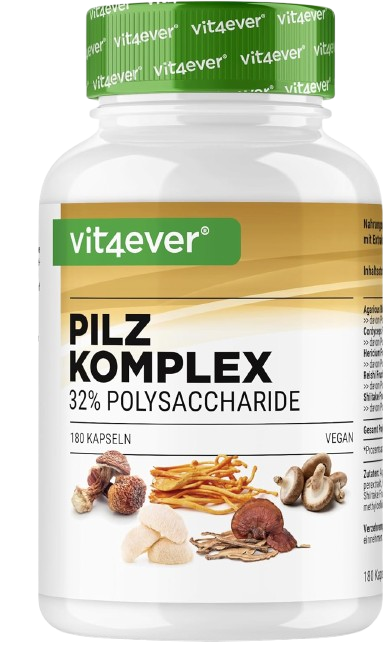 Ein starkes Preis-Leistungs-Verhältnis bei gleichzeitig hochwertigen Inhaltsstoffen liefert der Pilz Komplex von vit4ever. Es enthält fünf bewährte Vitalpilze, die in Form von Extrakten verarbeitet sind und insgesamt 480 mg Polysaccharide pro Tagesdosis liefern. Das Produkt kommt ohne künstliche Zusatzstoffe aus, was für besondere Reinheit spricht. Besonders positiv ist die vorhandene Laboranalyse, die Schwermetalle und mikrobiologische Belastungen überprüft. Leider gibt es keine konkreten Angaben zur Herkunft der Pilze, was die Bewertung etwas trübt. Dennoch bietet dieses Produkt ein starkes Gesamtpaket, vor allem für preisbewusste Käufer:innen, die Wert auf eine ausgewogene, wirksame Pilzformel legen.