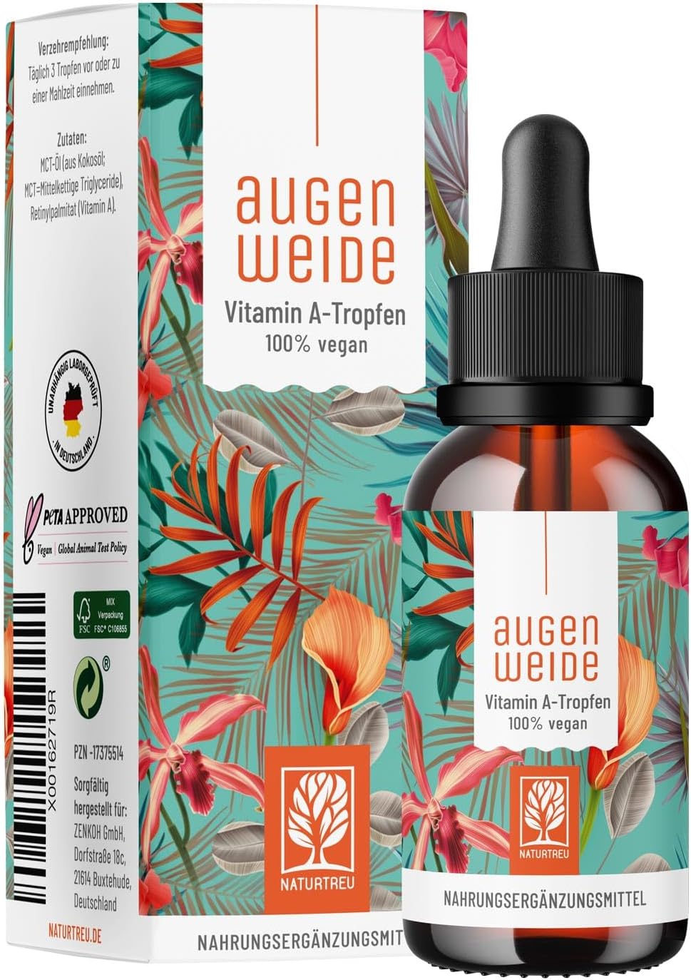Das Produkt "Augenweide" von NATURTREU ist ein Premium-Präparat, das sich vor allem durch seine hohe Dosierung und umfassende Qualitätskontrolle auszeichnet. Mit 5.000 IE pro empfohlener Tagesdosis ist es das am höchsten dosierte Produkt im Vergleich, was auch den höheren Preis erklärt. Ein großer Vorteil sind die ausführlichen Laboranalysen, die ein hohes Maß an Sicherheit gewährleisten. Das Produkt wird in Deutschland hergestellt und verwendet ebenfalls Retinylpalmitat in MCT-Öl. Dieses Produkt ist ideal für Nutzer, die eine höhere Dosis bevorzugen oder bereit sind, für maximal geprüfte Reinheit einen höheren Preis zu zahlen.