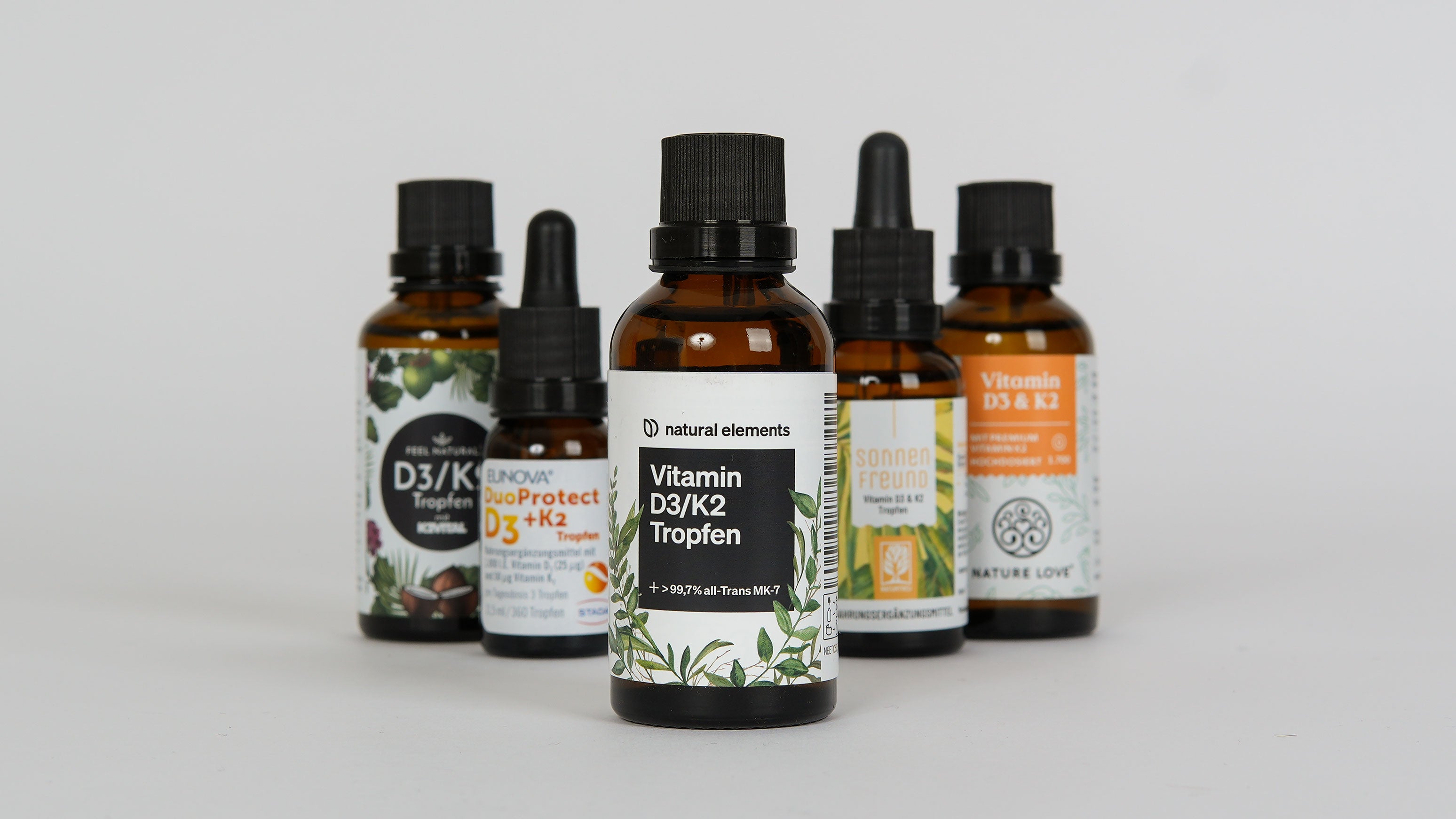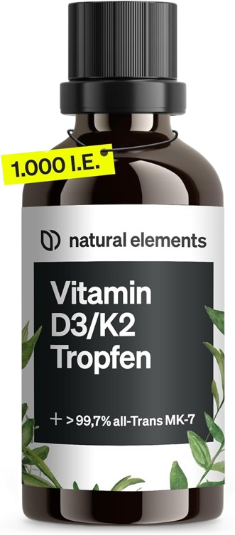 Die Vitamin D3/K2 Tropfen von natural elements gehen aus dem Produktvergleich als klarer Testsieger hervor. Besonders überzeugt hat unsere Redaktion die Herstellung in Deutschland, die Clean-Label Formulierung ohne unnötige Zusatzstoffe, ein einsehbares Analysenzertifikat (bestätigt Reinheit der Tropfen) sowie die Dosierung von Vitamin D3 und K2. Vor dem Hintergrund aller Qualitätsmerkmale schneidet das Präparat mit Abstand am besten ab.
